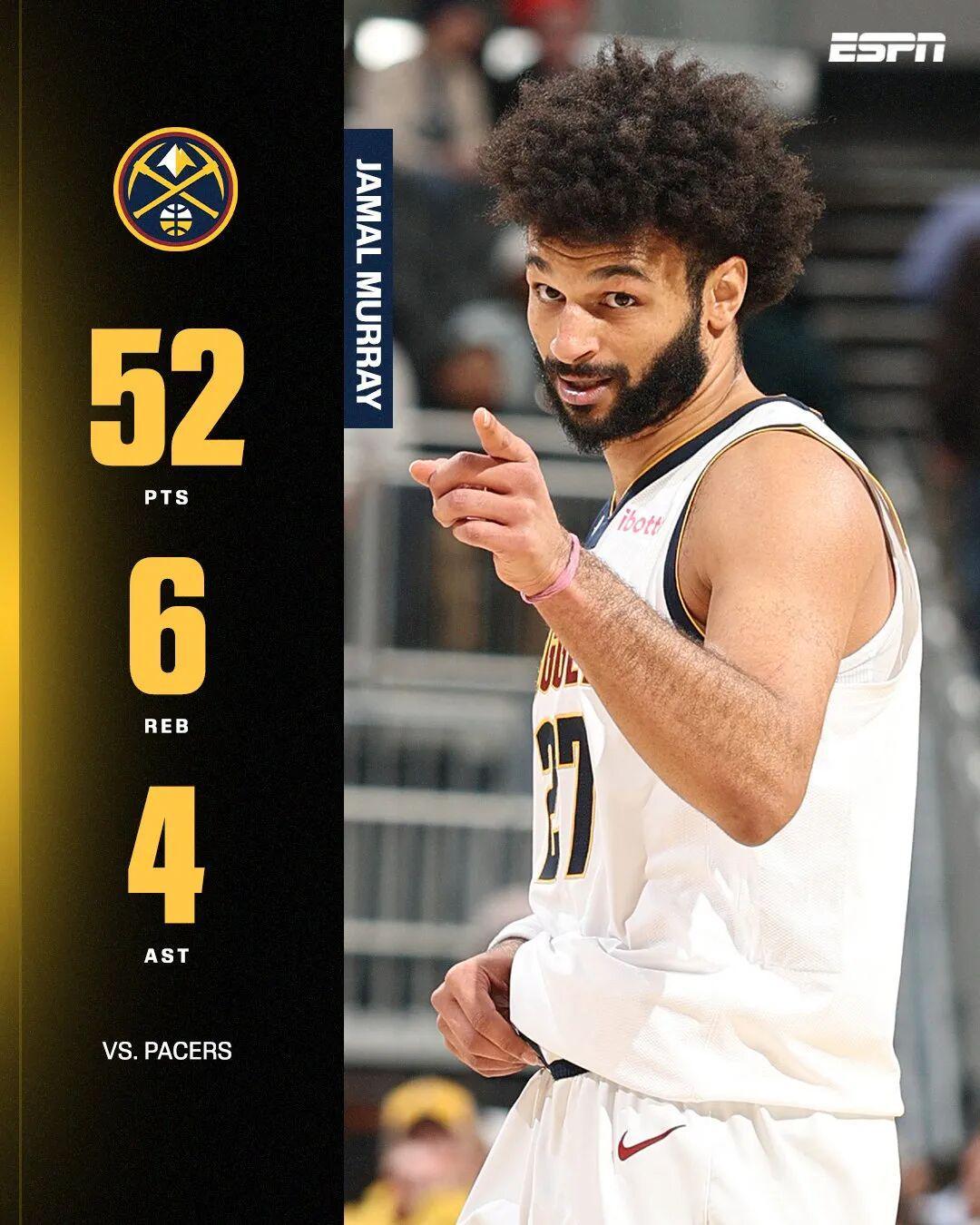 ——算上季后赛,这已经是穆雷第5次单场拿下50+,这个数字与欧文、亚历山大、约基奇、浓眉并列现役第13位