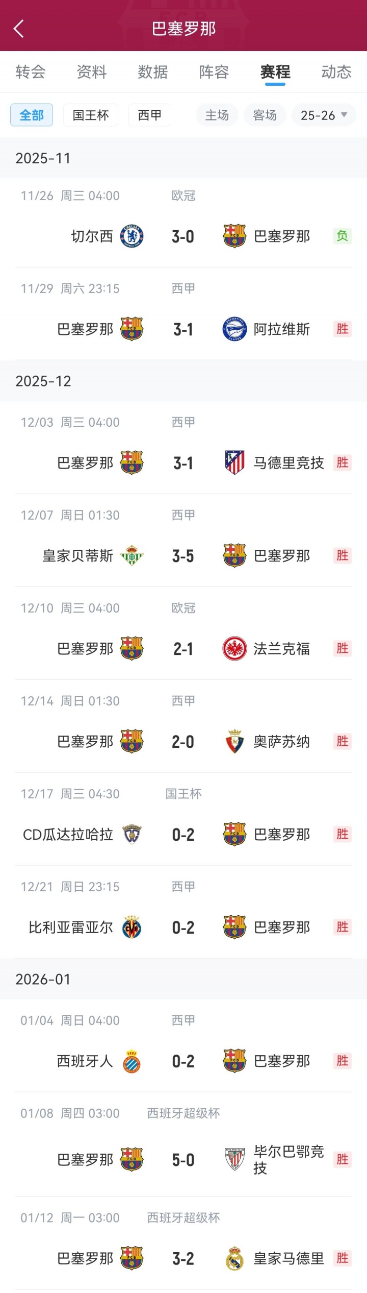 而巴萨在欧冠不敌切尔西后则是迎来了一波各赛事的10连胜,目前在联赛4分优势领跑,西超杯决赛也战胜皇马取得了新年首个冠军。