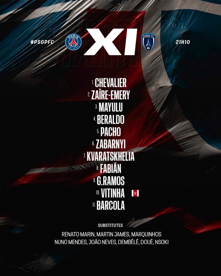 1月13日讯 法国杯1/16决赛,巴黎圣日耳曼将和巴黎FC交手。目前,巴黎圣日尔曼已经公布了本场比赛首发阵容,维蒂尼亚领衔,K77、巴尔科拉出战,登贝莱、马尔基尼奥斯替补。